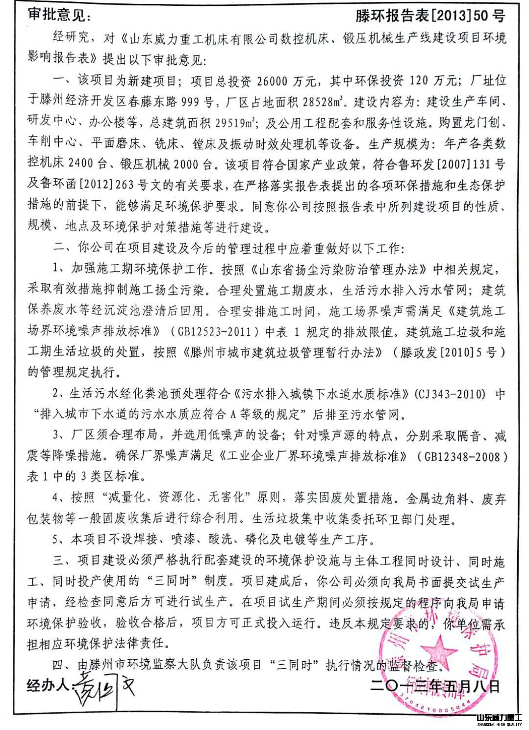 (2)滕州市環(huán)境保護(hù)局對山東威力重工機床有限公司數(shù)控機床、鍛壓機械生產(chǎn)線建設(shè)項目的審批意見(滕環(huán)報告表[2013]50 號 2013.5.8)